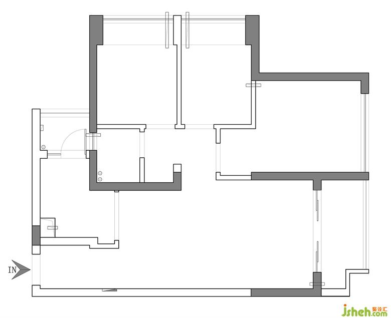 ➋厨房空间较小,操作台面不足,且一门之隔的生活阳台闲置过于浪费。
