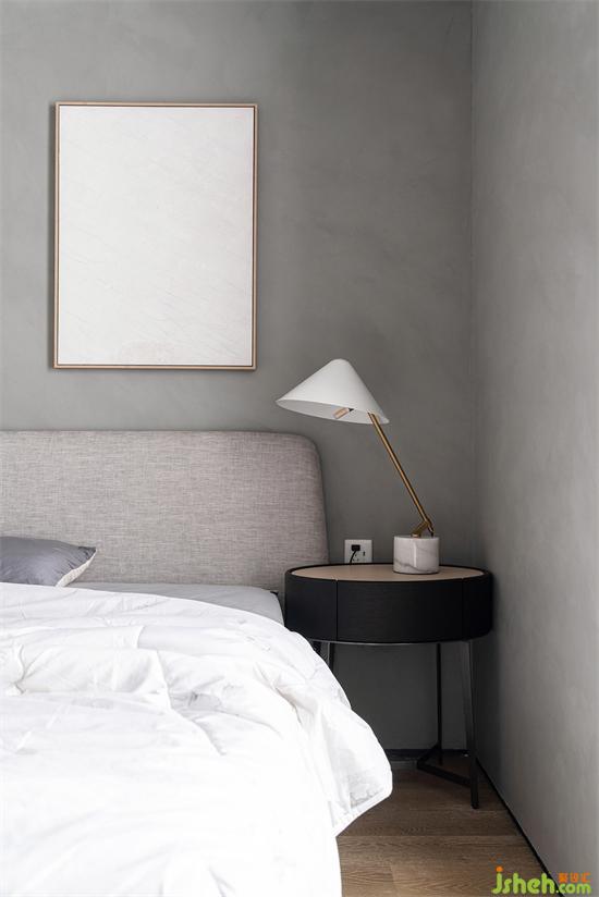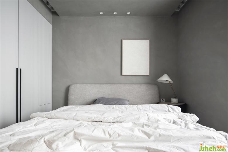 次卧与整体空间色调保持一致,同样以简洁为主,柔软的白色床品搭上整体的水泥色色调,给人一种干净舒服的感受,整面衣柜也满足了日常衣物的收纳。