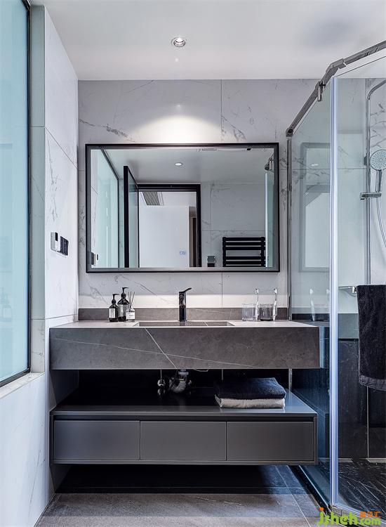 主卫与主卧连接处是整面电动雾化玻璃,可一键切换通透或私密。家装设计深色系地砖搭配浅色石材墙面和灰色悬空卫浴柜,空间层次更加丰富,兼顾颜值与实用。