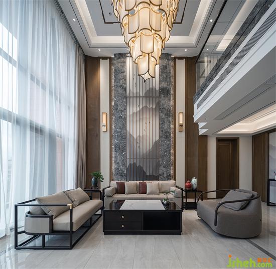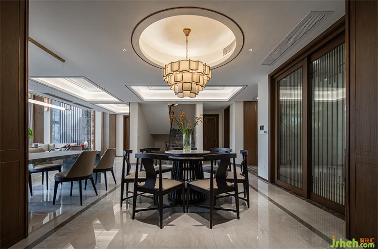 新中式风格给家带来了许多沉稳的感觉,别墅装饰设计师以儒家思想文化基础做了整个空间的设计。儒家文化最重要的设计元素为回形纹,回形纹代表着吉祥如意。这与儒家文化的核心-“仁”也是相符合的。同时,通过整体环境的营造,自然得将回形纹的设计元素融入设计中,从而避免了设计元素的简单堆砌。