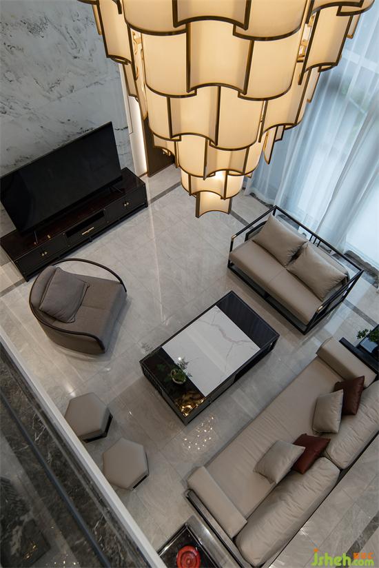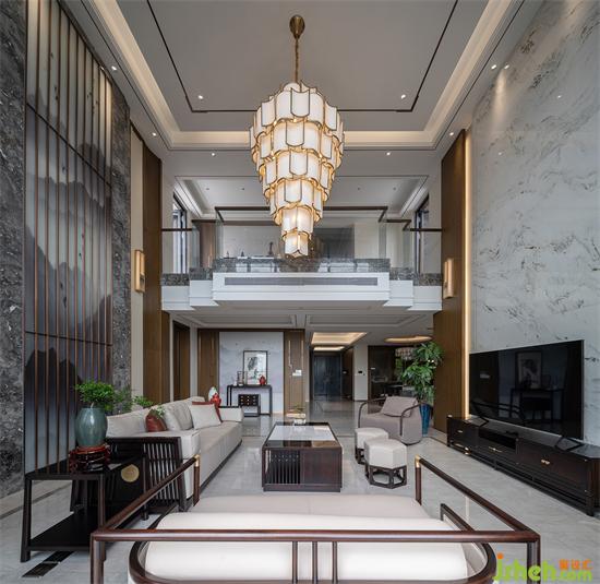 一层大挑空视线开阔,并可以饱览窗外的海景。仿云彩的电视墙,山水意境的沙发背景,选择了木质、皮质、金属等材质,别墅装饰让整个空间充满中国古典之美。