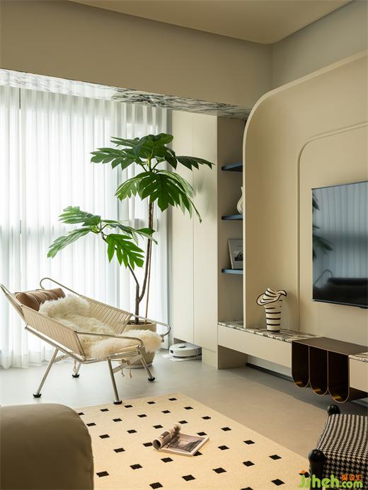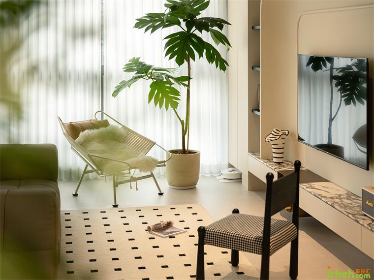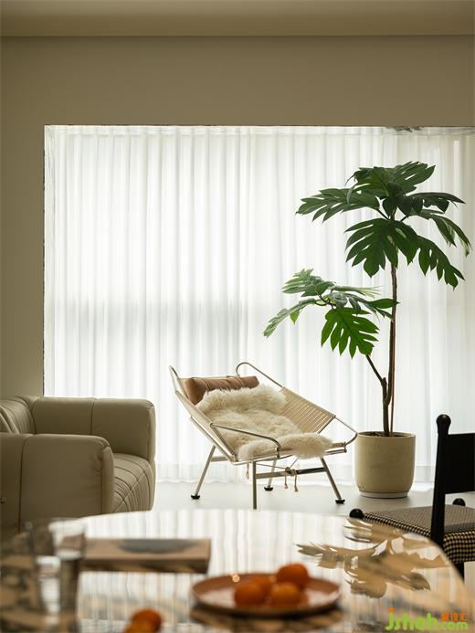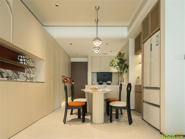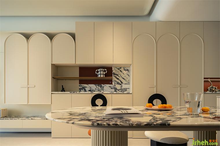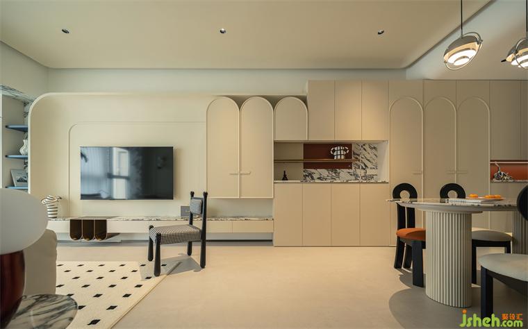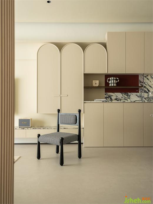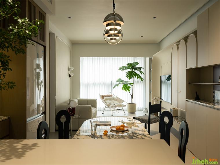 2、餐厅与公卫之间做s形墙,使餐厨一体化且扩大整个空间的比例。