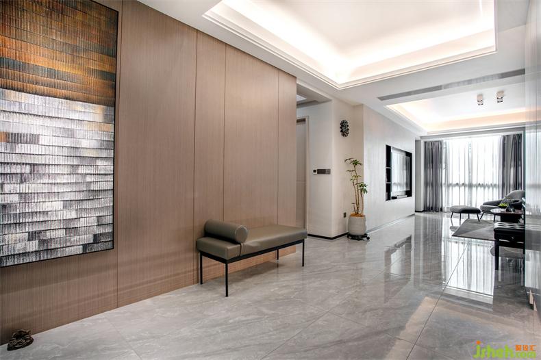 入门即见玄关,材质与光影组合的自然气息蕴染底调,室内设计师功能隐藏在二维视野与三维格局里。隐藏式的鞋帽柜做悬空处理,对面就是鞋凳,方便换穿平时的居家鞋。