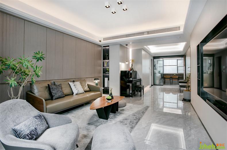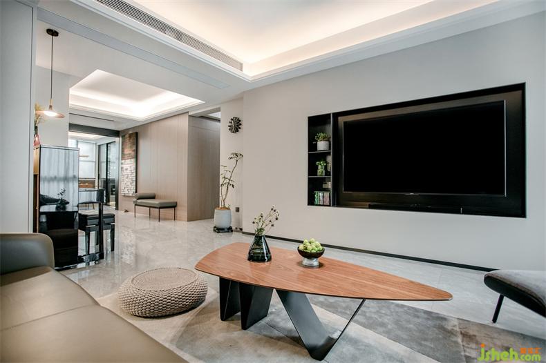 无论是满足收纳的客厅背景柜,还是嵌入墙体的书架、75寸的电视,室内设计师都构成了整洁的平面造型,让整个空间感开阔了许多,也兼具了功能与美的艺术。