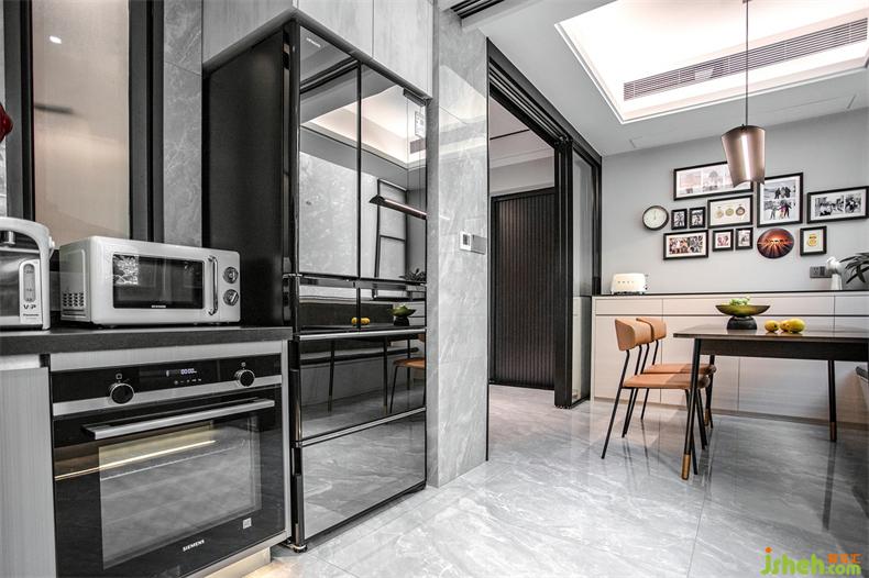 主卧的对面是多功能室,即独立衣帽间&书房,考虑到整洁性,室内设计师衣帽间一面选用了黑色玻璃柜体,一面是木饰面柜体并镶嵌了一扇镜面,经常外穿的可以一眼看到,又不会显得杂乱。