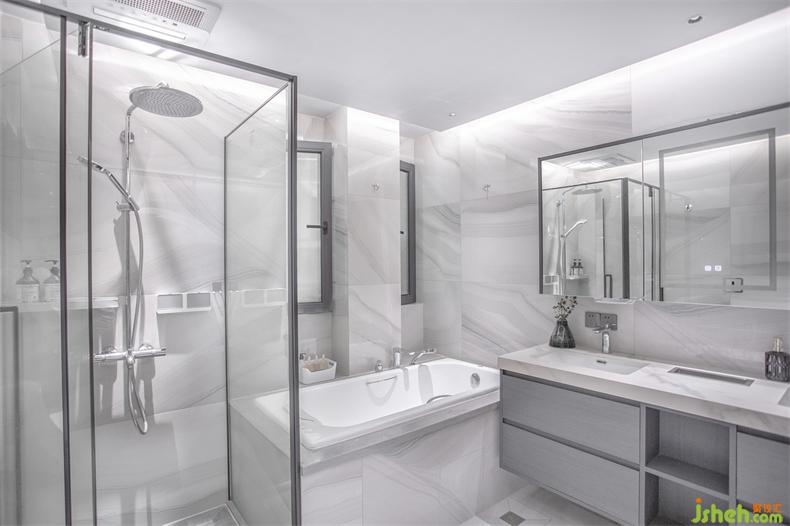 相对简单的主卫,公卫反而做到了“一应俱全”,而且空间面积大,还能通过窗户进行采光,映衬着厚重的大理石和其天然轻灵的纹理,自然而生静谧之境。