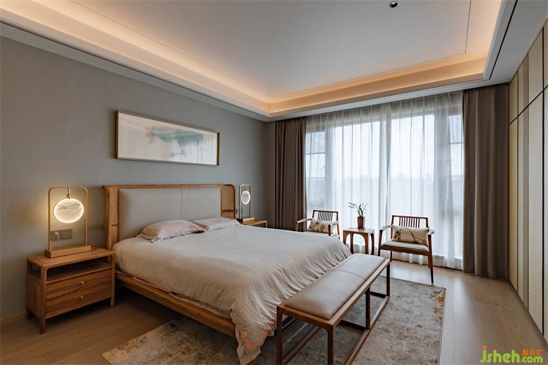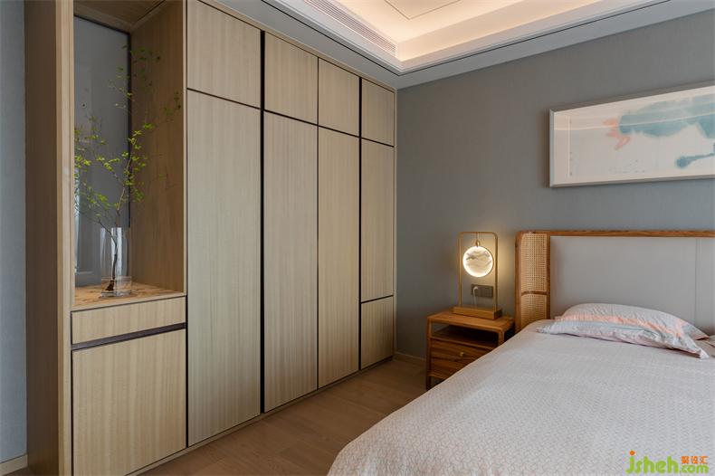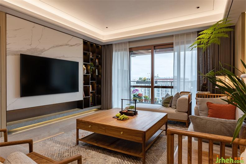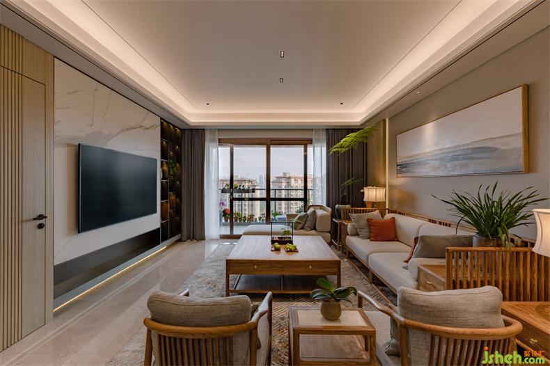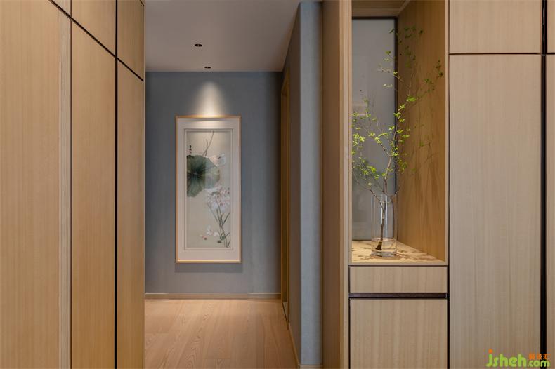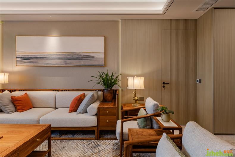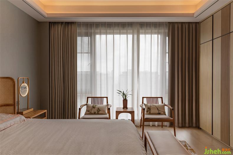 设计引木造舍,并以山水为元素,植物点缀,室内设计师让感官在自然的包裹下逐渐沉静;糅合软装陈设所营造出的东方美学。以水墨勾勒的电视背景墙,衔接着深浅不一的隐形木门与柜格,循循渐进,如同画卷一样展开,在悠悠岁月里,简单却亲切。茶隅借鉴中式园林的透景,以空窗为界,开放且宁静;氤氲而起薄雾,更在虚实之间衬得惬意,室内设计师生活、自然全在这禅茶一味中。