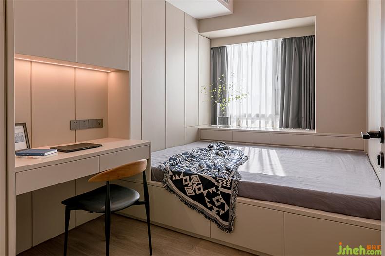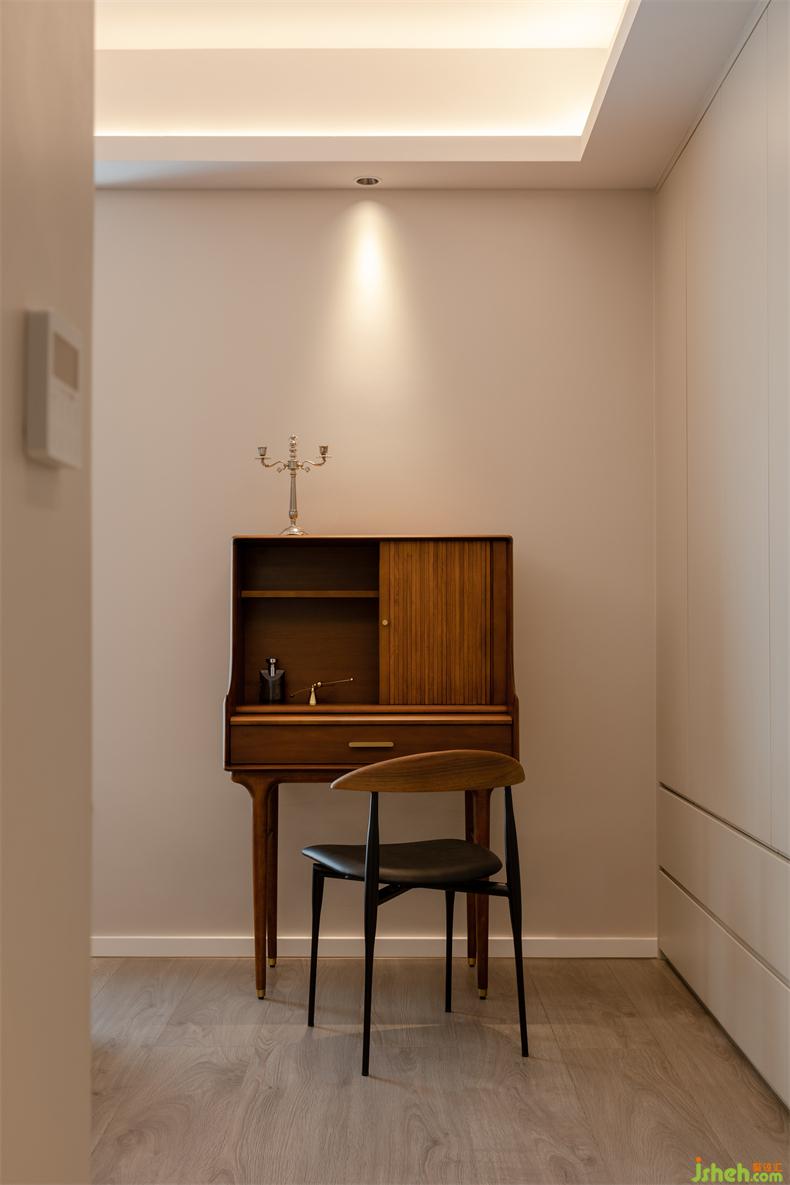 以简雅为韵调铺垫的主卧,室内设计师形室内设计师式极简但功能一应俱全。空间材质跟随光影灵动,渐入到平和的氛围中。可移动的窗台茶几、复古的梳妆台桌把简约主义和实用主义的特点综合,就像隐藏式的衣帽柜,打开即是使用,关上即是生活的艺术和美。