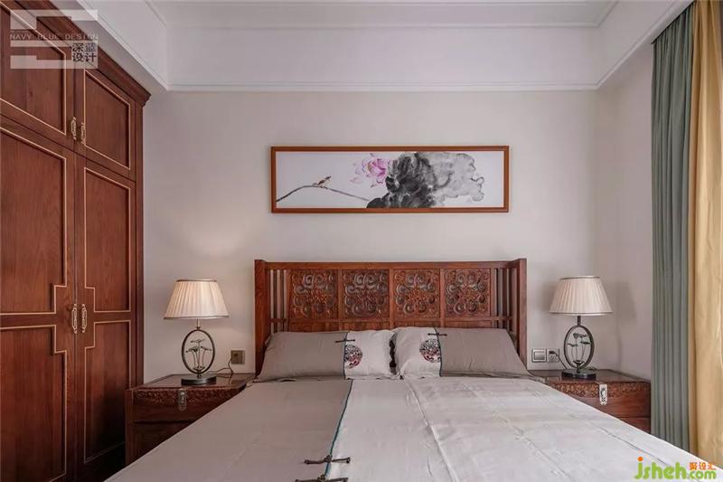 坐看云舒,看一季花开。父母房延续主卧基调,只在背景画、台灯、床品上稍作改动,更为淡然素雅,安住似水流年。