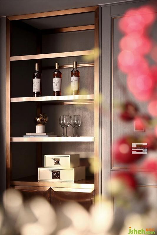 宝格丽绿的反光墙板延伸视觉空间的同时唤醒空间的活跃度;大理石纹岩板操作台和延伸而出的小吧台,形成一个社交互动的空间,休息时可以和家人、朋友一起烘焙、喝下午茶等,将时尚与生活结合,满足都市贵族的社交聚会活动。