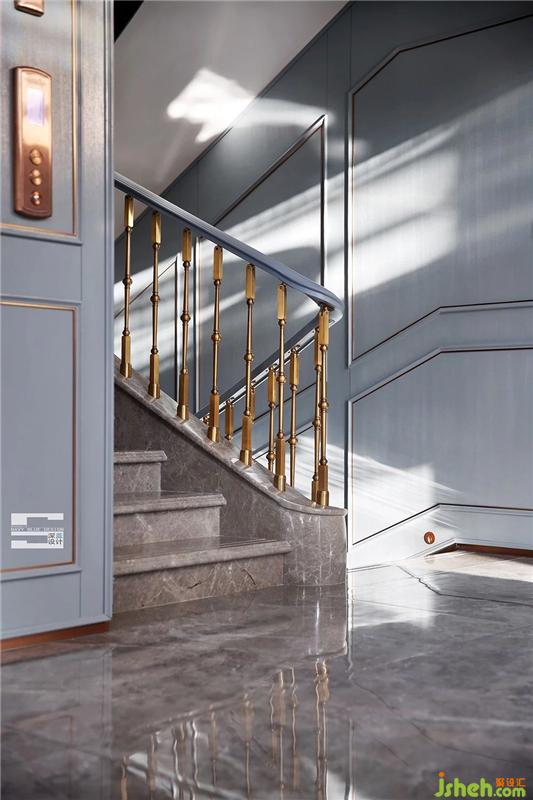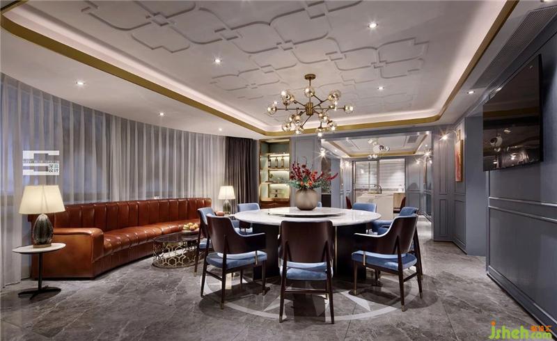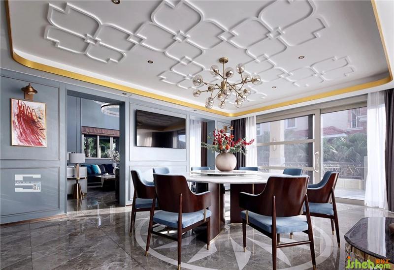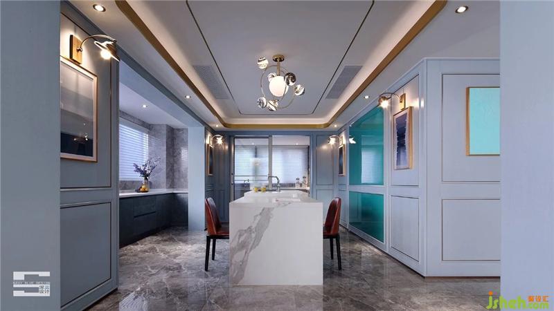 圆在中国有着一家人团团圆圆的寓意,在仪式感很重的餐厅中配以白色大理石圆形餐桌,不仅提升空间的亮度,更有助于家人之间情感的升温;吊顶之下淡雅大理石的圆桌搭配深木饰面座椅,椅腿与阿玛尼的蓝色丝绒坐垫,无一不从细节上展现设计师的巧妙心思;金属边框红色艺术挂画打破静谧的氛围,使餐厅多了一份热闹、活泼,仿佛听到一家人围坐在餐桌边吃饭时欢声笑语。