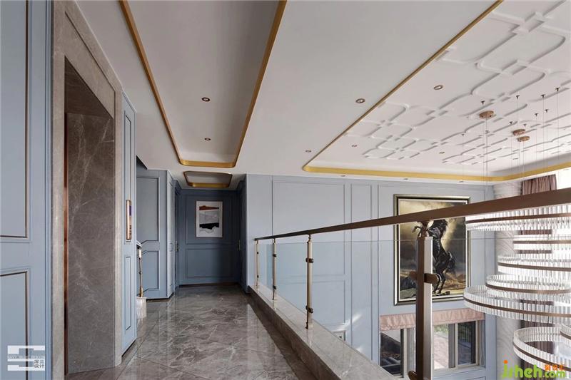 二层走廊大面积透明玻璃自楼梯口处延伸环抱,平静且节制的展示方式增强了一楼与二楼之间的互动性,古堡灰地砖与跳跃黑马图案的金属边框挂画相得益彰。我们通过材料连贯与区分,勾勒空间的韵律,营造出一番别致韵味,整体线条简约流畅,干净利落。