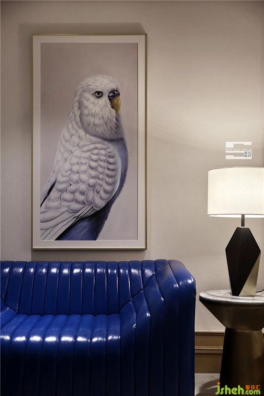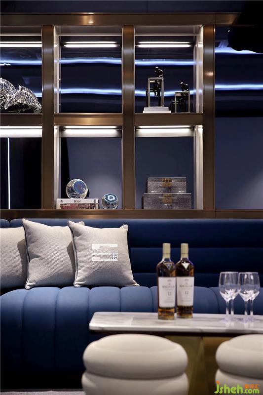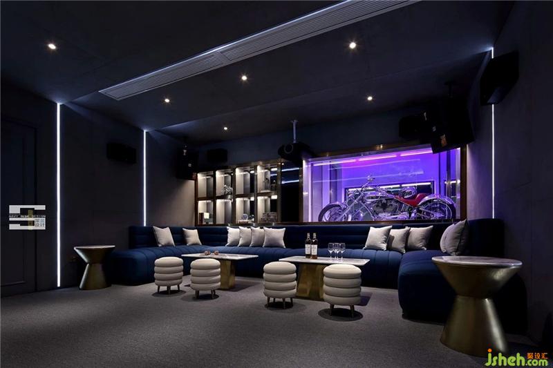 整个空间以灰色为主调,搭配科技感十足的灯光,让空间更具层次感;圆润造型的U型宝石蓝丝绒沙发以及自然舒适的浅灰色抱枕、茶几凳让空间充满温馨感,在此容纳家人促膝长谈,谈心嬉闹的美好记忆;展示墙金属边框、金属大理石茶几、金属椅脚等金属元素在暗黑的影音室里散发一股低调奢华的气息,卸除不必要的装饰,所有线条克制而必须。