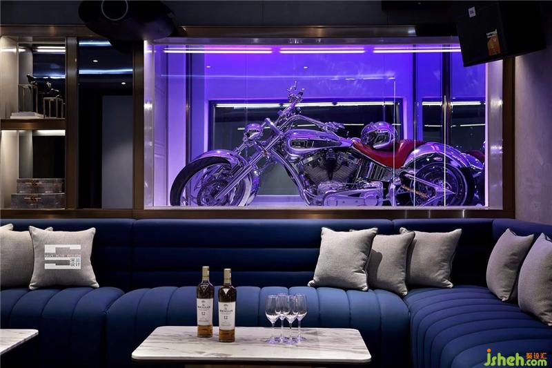 定制版的哈雷摩托车在整个空间中起到画龙点睛的作用,在与业主沟通中,设计师了解到业主对哈雷摩托车的需求:既要展示,又要方便骑行。而影音室后面是车库,设计师利用车库刚好比影音室的地面高出1.1米的落差优势,定制了一个哈雷摩托车停车库与影音室通透的展示柜,满足了展示与实用的功能。