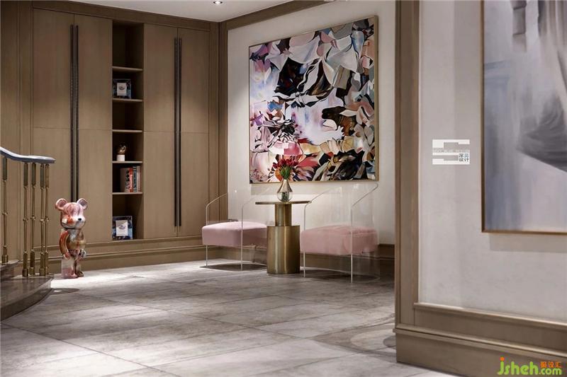地下室门厅以浅色木饰面与米色墙面为基调,透明粉色丝绒座椅与金属元素相配合,彰显主人的优雅品味,使空间更加舒适柔和;大幅彩色油画与BR@RBRICK彩色积木熊相呼应,提升空间艺术感。