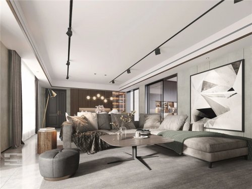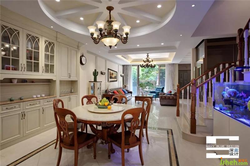 没有繁复的装饰,在统一的色调与材质下,勾勒出自然地美式风情。纹路考究的吊灯,背景墙上富有时间沉淀感的风景画,为空间增加了多重纬度的美。