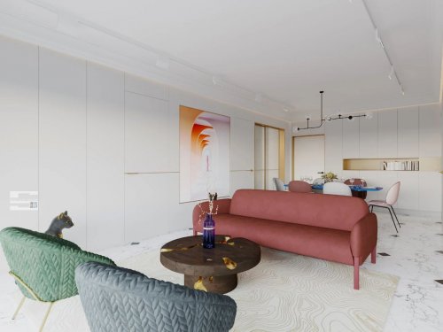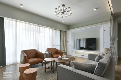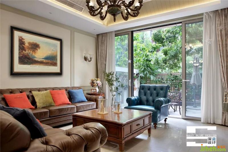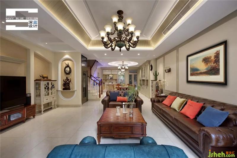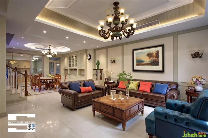 一层的客餐厅布局通透敞开,将窗外的自然最大化地引入,挑高层高四方格局,有种恢弘大气之感,设计师用大量咖啡色家具装饰,令气氛沉稳,用跳跃的蓝色、红色化解冷硬感受。