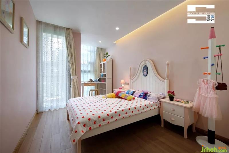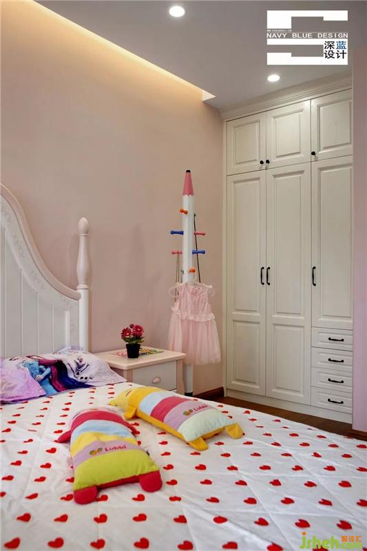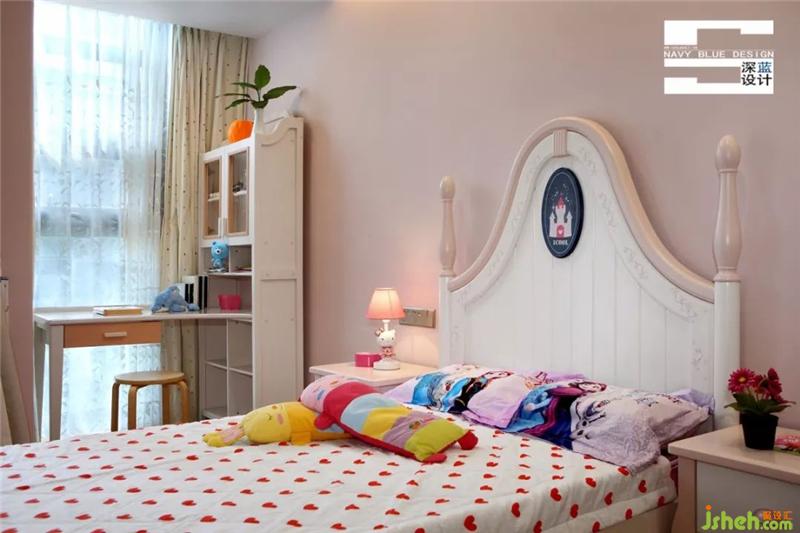 温馨的粉红色为空间的主基调,柔美轻巧的家具,浪漫唯美的纱帘,为营造一种甜蜜的气氛起到点睛之笔的作用,还有充满爱心的床品,俏皮可爱的玩具,当这些元素与粉色基调交相呼应,赋予卧室新的视野,体现了公主房的梦幻与甜美。