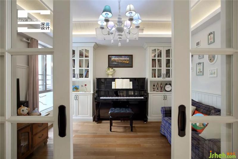 推拉门式的休闲室内,钢琴居于视线正中央,两边是靠墙的书柜,方便孩子静心练琴不被打扰,舒服的布艺格子沙发,是孩子们的休息区,还有各式各样的玩偶摆件引入,打造专属于孩子们的一方天地。