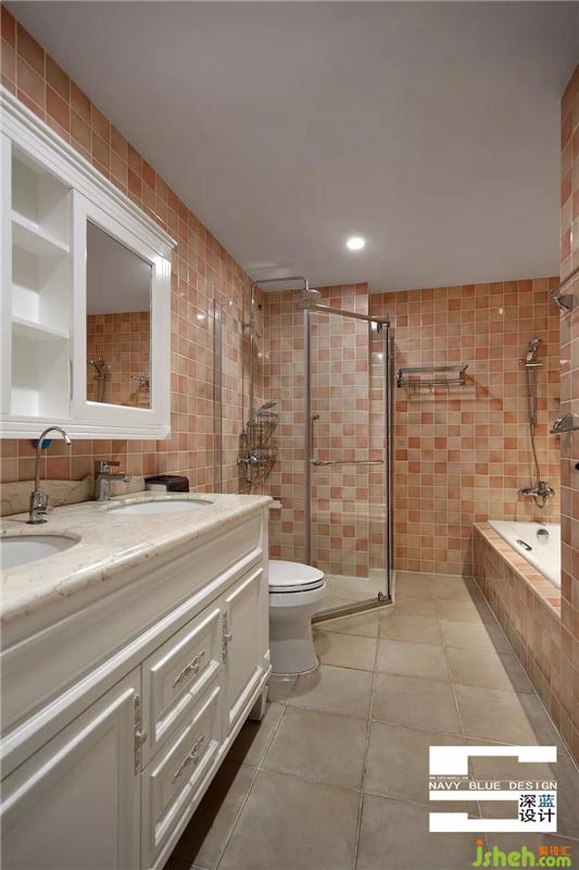 彩色小方块瓷砖铺满整个墙壁,搭配白色卫具,整体给人轻松、舒适的感觉,合理的设计空间,满足了淋浴、泡澡多重享受。