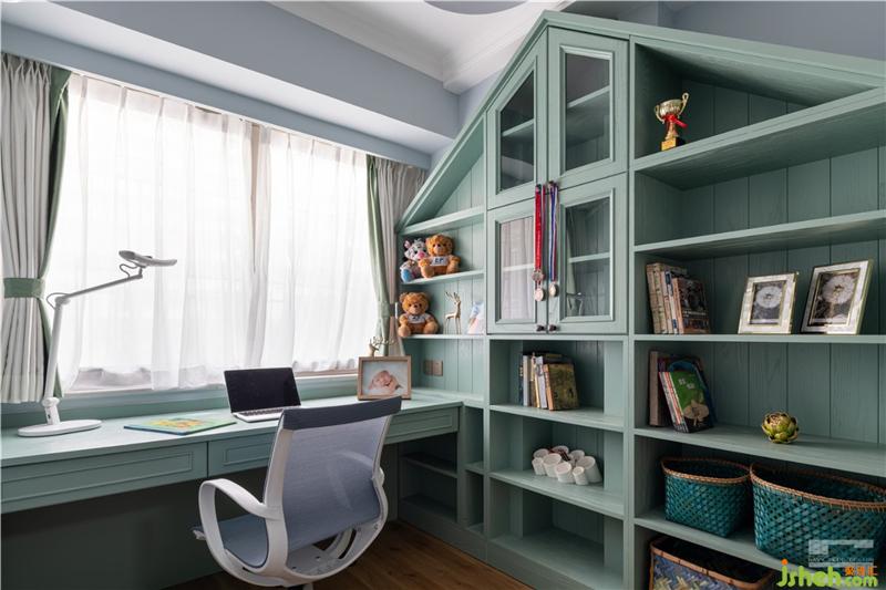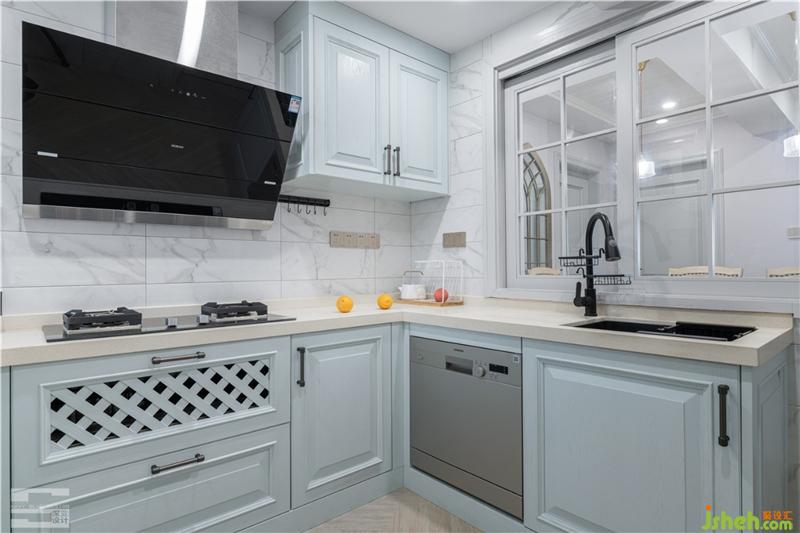 厨房是采光弱区,薄荷蓝的橱柜和白色大理石纹的墙壁使厨房变得明亮,自然光线透过玻璃窗照射进来,厨房变得通透。