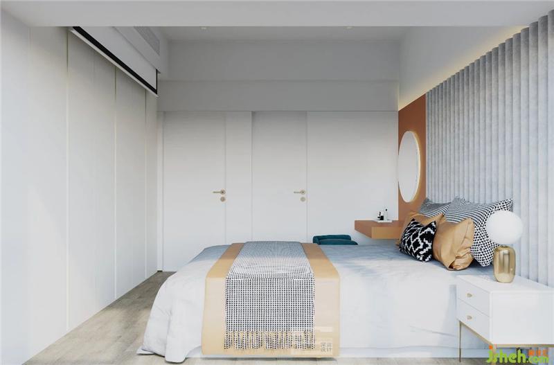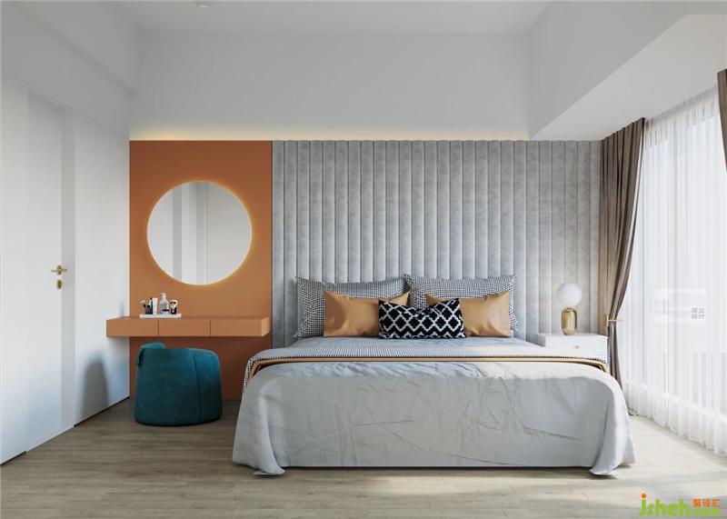 卧室延续空间的整体性,在主色调和灵动的线条不变的基础上,相对于公众空间的冷调,这里主要以暖色为主,对比色橙色来点缀空间,无论是组合梳妆台还是床上用品,都透露出一股温暖气息;灰色丝绒褶皱床头背景墙,无论是材质亦或是造型,都散发出轻奢的质感。