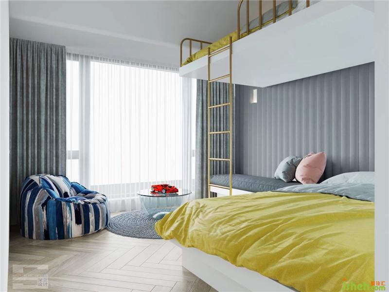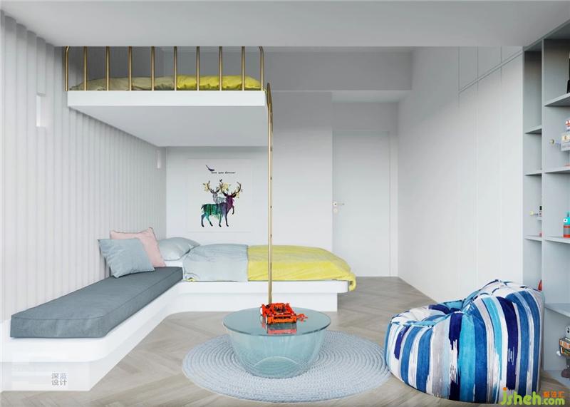 在人的各种感知觉活动中,视觉占据着主导地位,色彩环境对人的情绪、智力、个性发展有着重要影响,尤其是对儿童身心发展起着重要作用。在色彩上,更偏向选择活泼明亮的颜色进行搭配,明黄色的床单被罩、浅蓝色的茶几和懒人沙发椅,用墙上的麋鹿挂画跳脱,多彩的搭配营造出快乐的氛围,空间不仅明亮,还很柔和。
