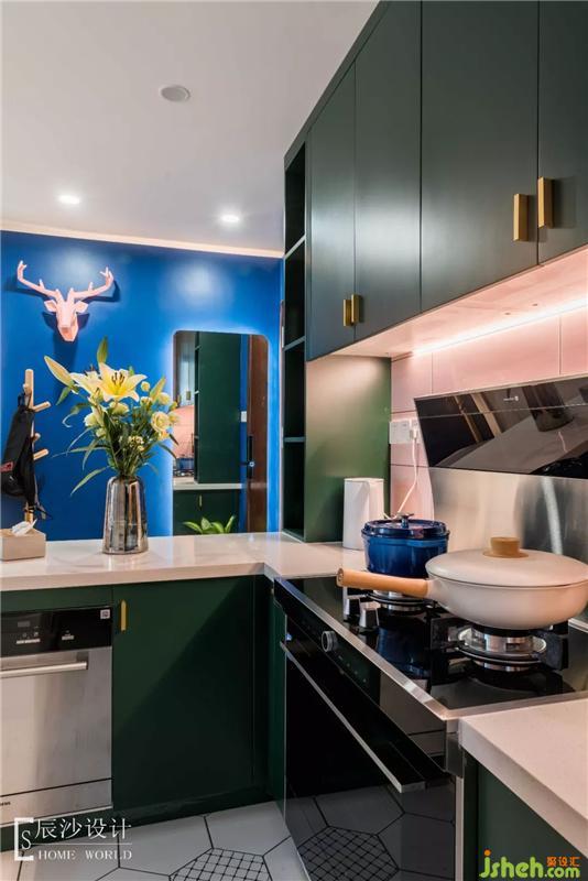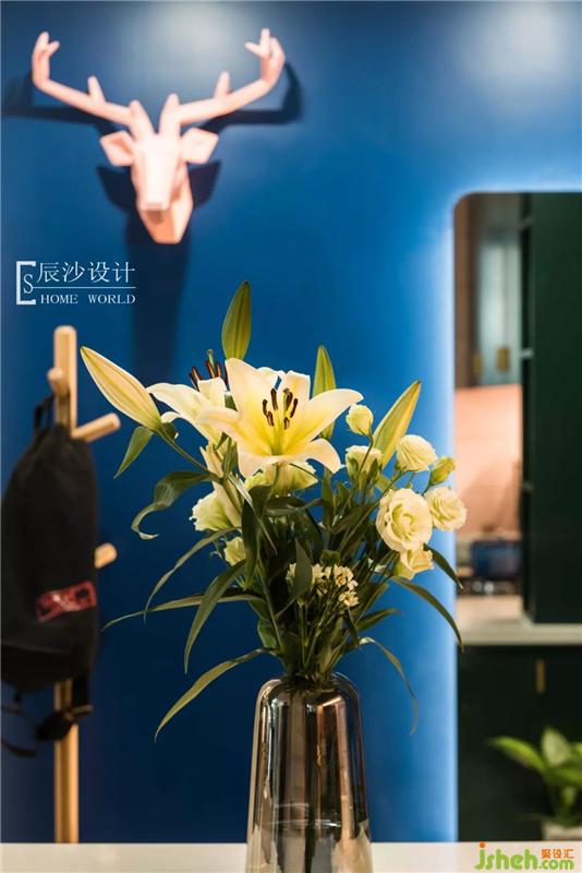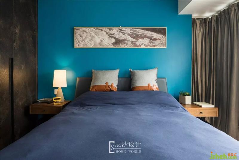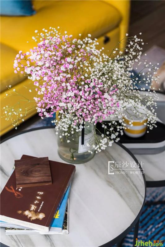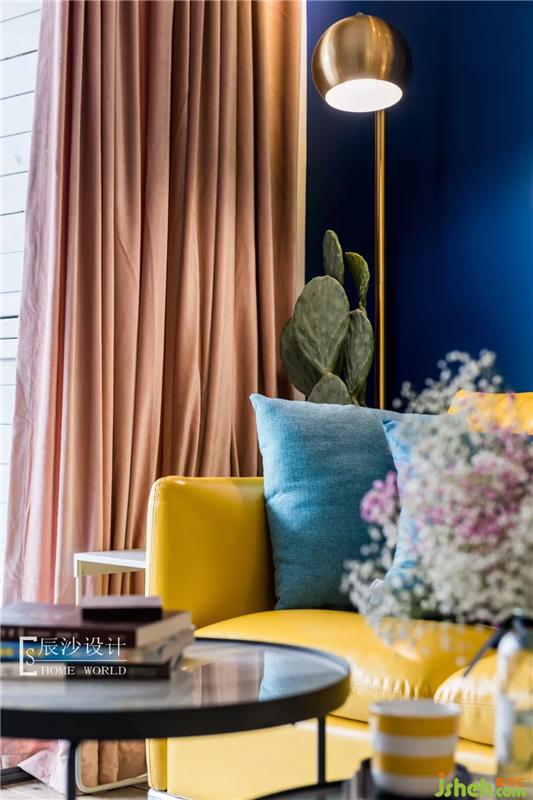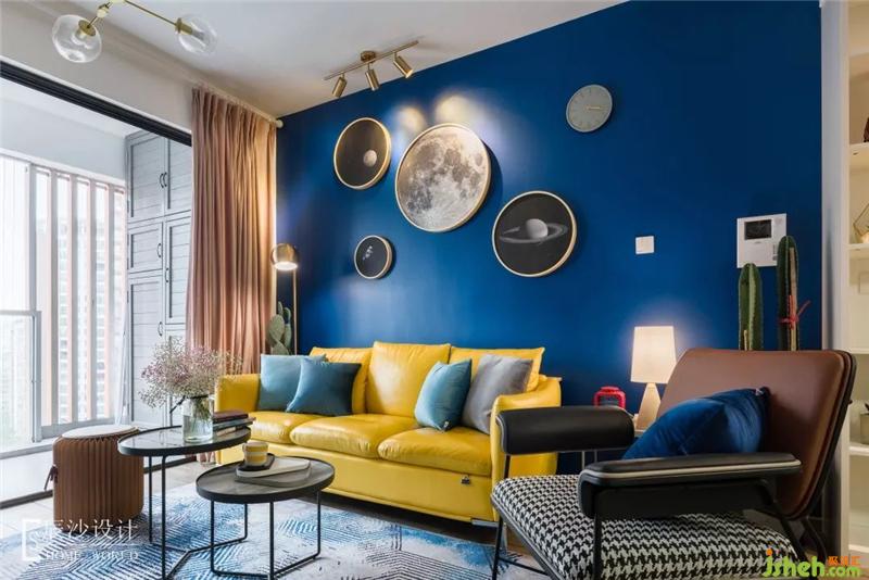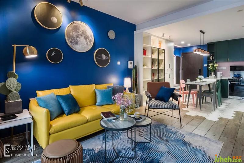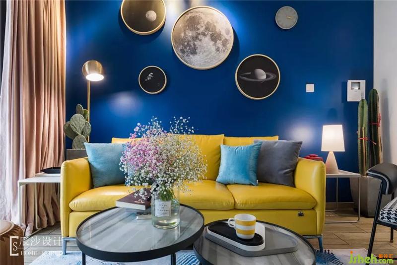 客厅在色彩上主要运用蓝色和黄色,静谧之中又有点活泼气氛,配合蓝色墙漆搭配的金色边框星球挂画,让整个空间充满艺术气息,仿佛遨游在小王子太空中,寻找着属于自己的那份童真。室内设计师