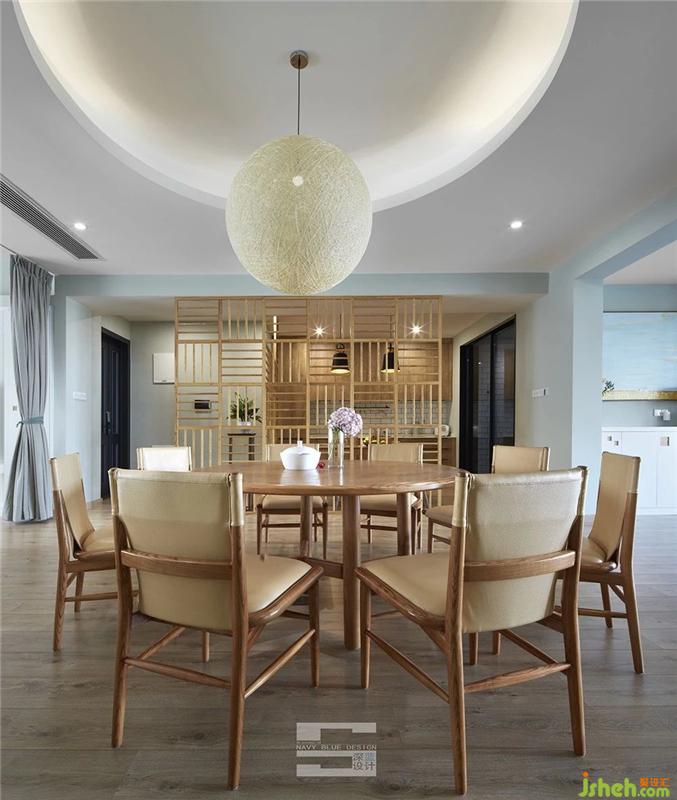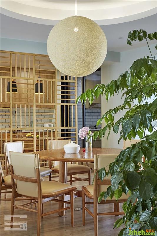 餐厅与西厨相衔区域格栅屏风的设计,使两个空间互相独立又互相接连,从美学和功能的角度释放空间潜力,打造耐人寻味的氛围写照。