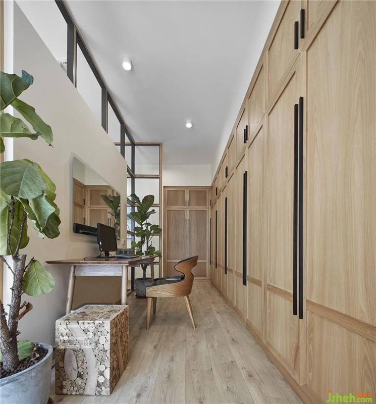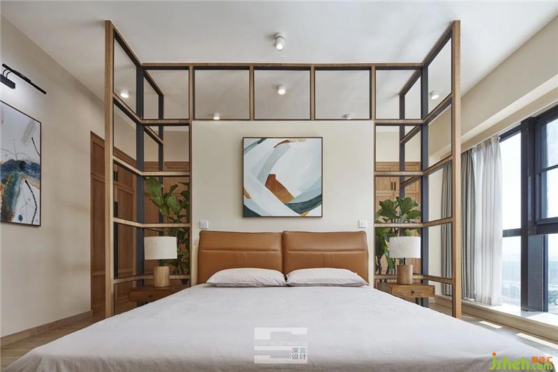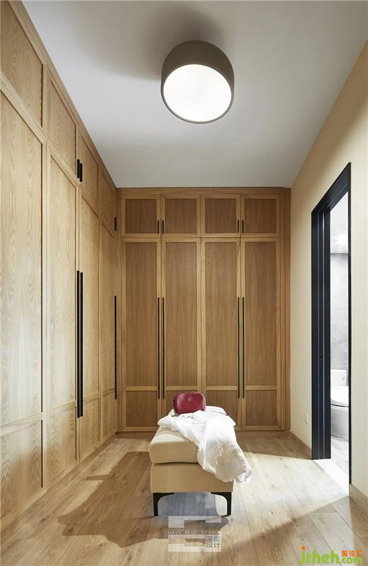 与整体有异曲同工之妙的主卧,原木家具糅合在淡黄色的墙面,卧室变得更加的柔和、舒适、放松;定制的原木床架,将休憩区与衣柜、工作台区分开来,在空间布局上营造出了迷人的氛围。