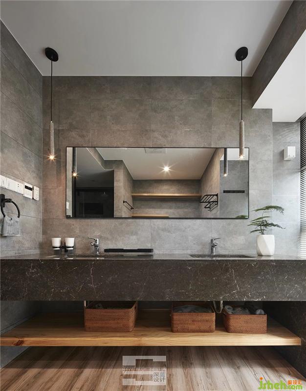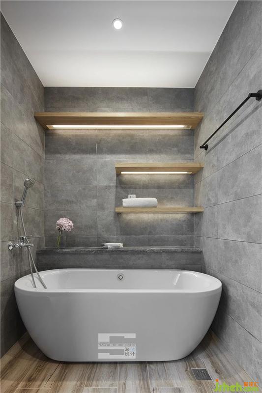极简的主卫,因为有尺寸的加持拥有极好的配置,获得了极大的舒适体验:双台盆、落地大浴缸、独立淋浴间、独立马桶区;双台盆既满足基本洗漱功能,还可以收纳生活用品,台面干净清爽。室内设计师