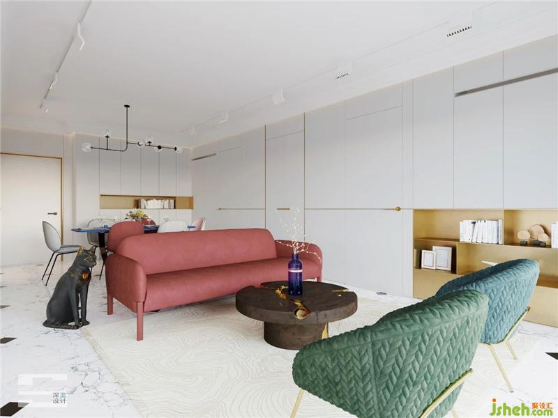 皮质的宫殿红沙发与丝绒的翡翠绿单人沙发,无论在色彩上或材质上,带来精彩的视觉冲击,单白的空间盈满春季的气息;宫殿红和翡翠绿历来是经典的搭配,空间古典高贵,却不失时尚感。室内设计师