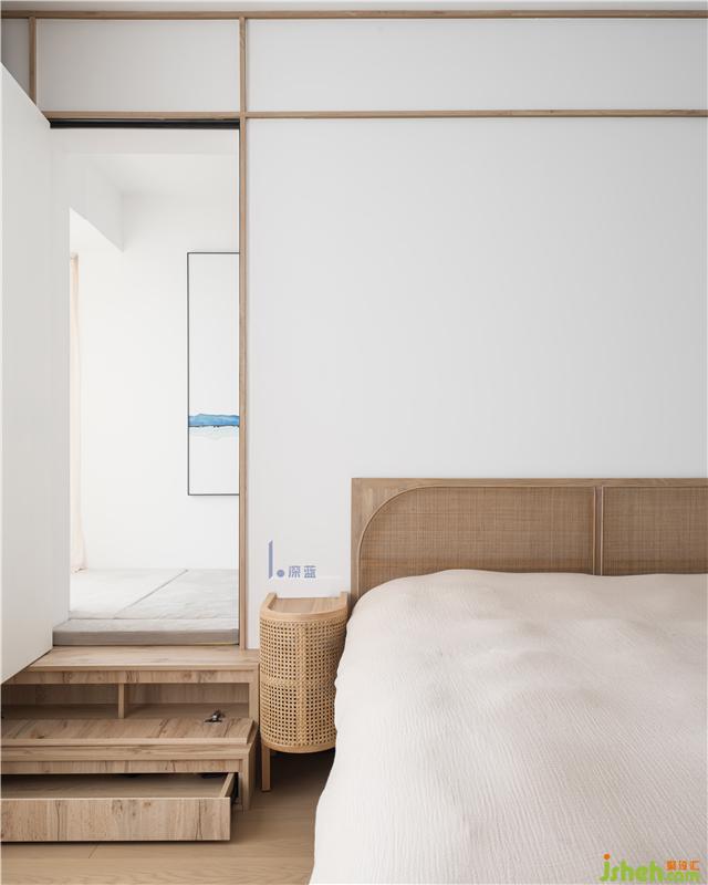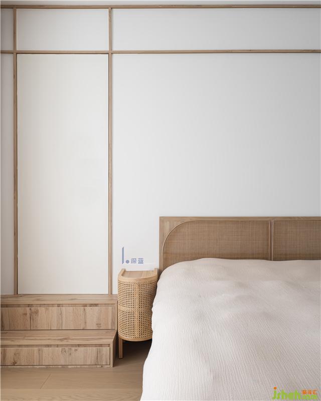 因为主卧床头后面有一个休闲区。我们做了隐形门的效果。两步台阶也做成了储物空间。既美观又实用。