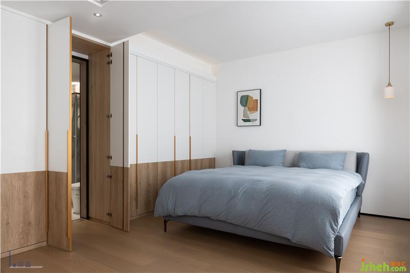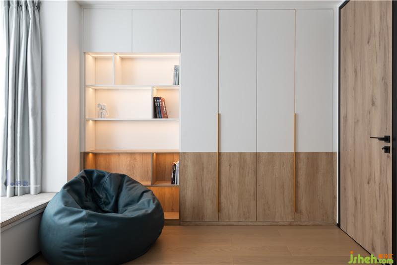客房柜门和阅读区域柜体都做了分色工艺,家居设计增加空间层次和休闲感。其中两扇门打开通往卫生间。使得柜子整体性更强。