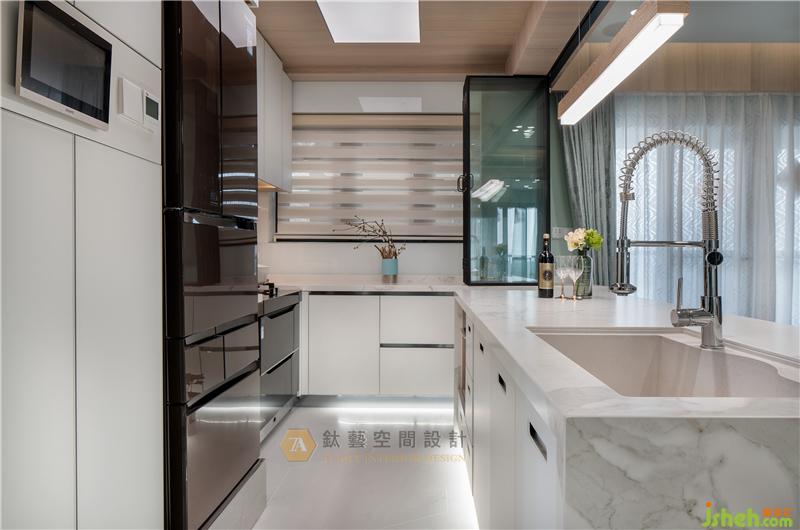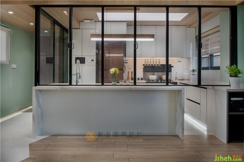 厨房趟门轨道与吊顶有秩序的结合,同一空间内收放自由转换,可封闭、可开放,实现空间的灵活多变性。空间的相互流通与连接也将生活的重心扩散到整个住家空间。