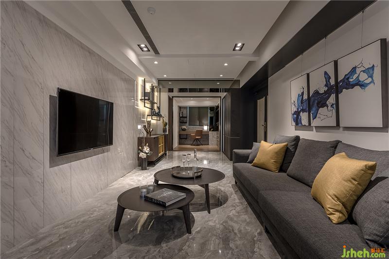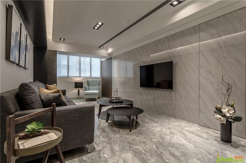 狭长的客厅格局,透过电视墙面分割比例与浅色天然大理石的质感呈现出属于豪宅的尺度与气场。室内设计师