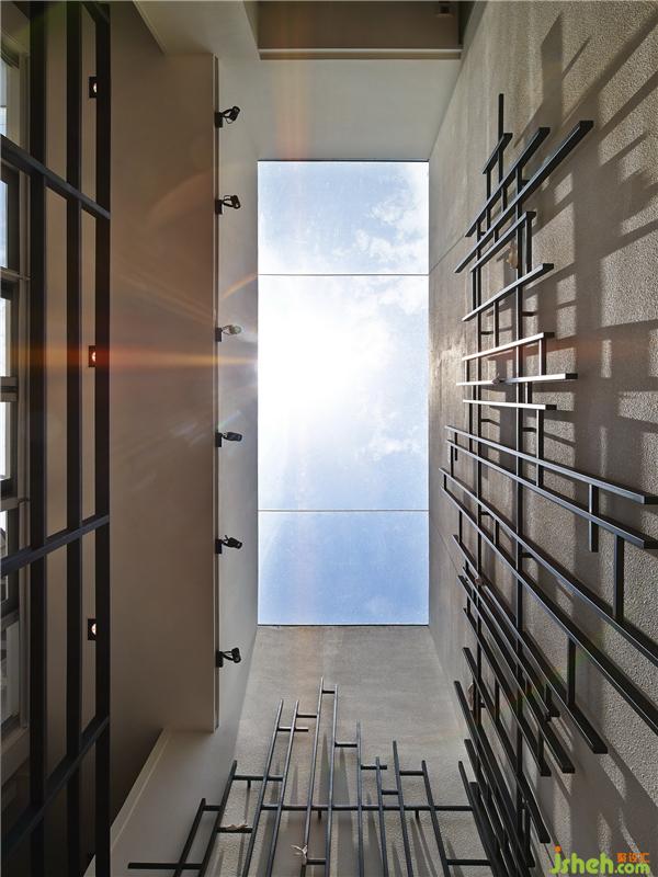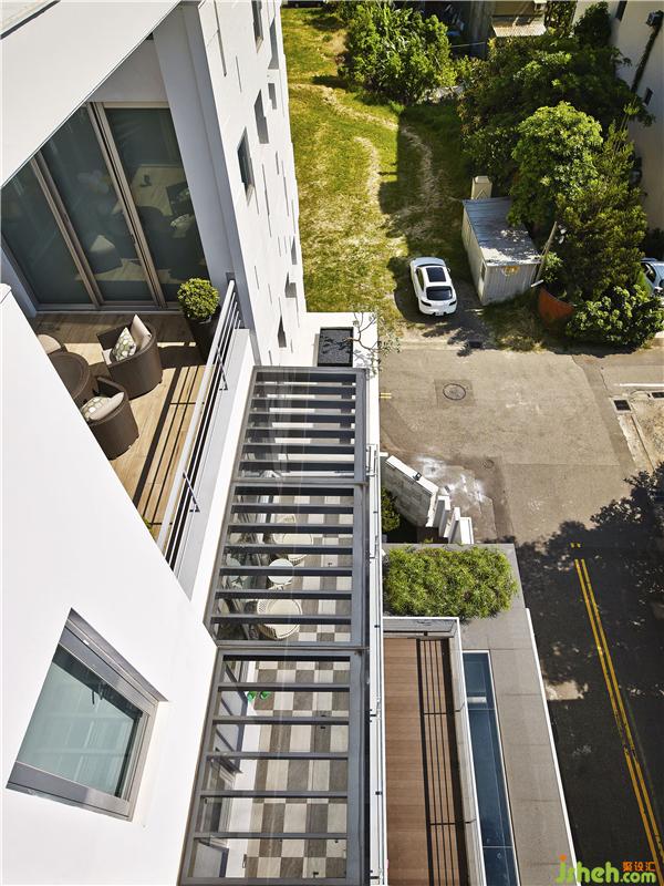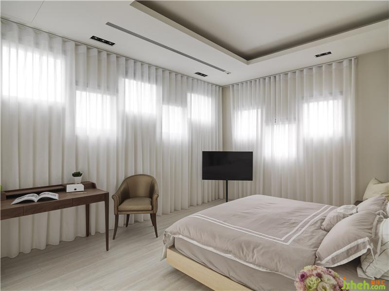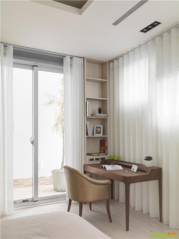 三楼别墅设计,卧室以清爽舒适的浅暖色调,营造舒心的睡眠环境。同样以玻璃窗打造穿透性效果,使自然光线进入居家空间。