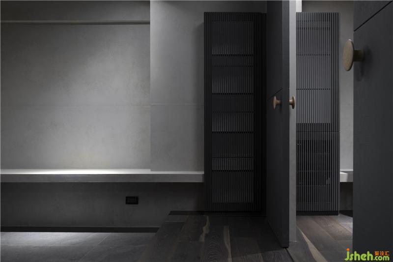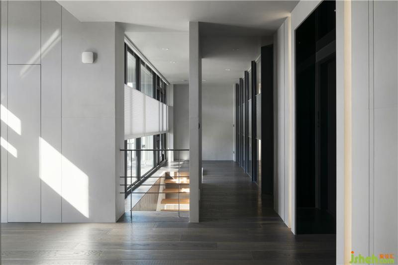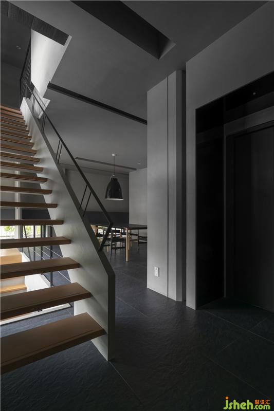 建筑之内,深色系的地砖与灰白墙面形成强烈对比,深沉冷静的格调,即便没有华贵之物衬托,也尽显主人的庄重个性和气质非凡。抬高的廊道贯穿整个空间,由客厅起始一直延伸至西厨,加强了空间立体感。