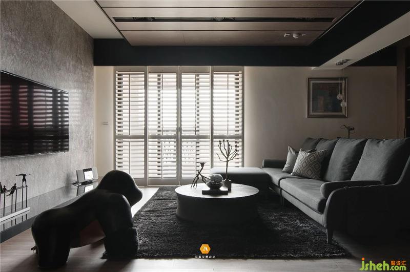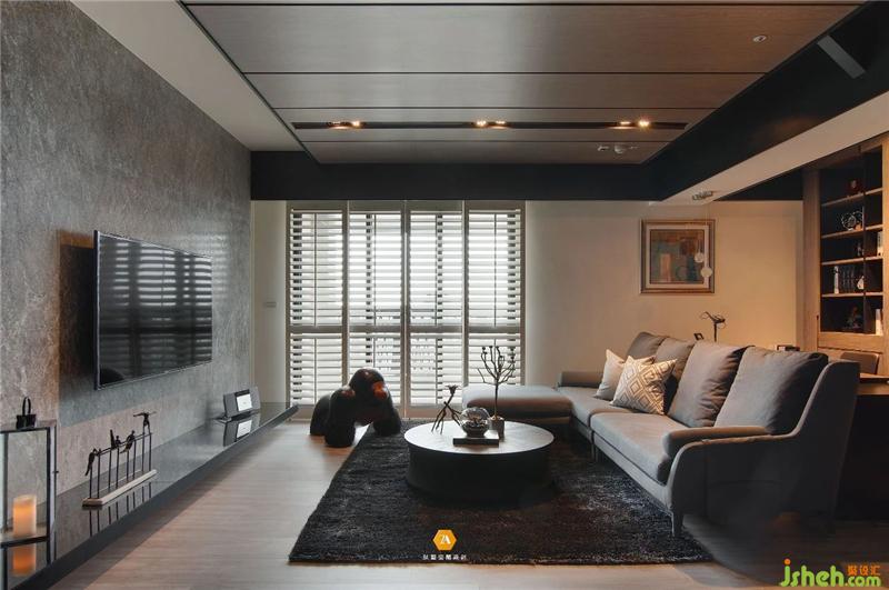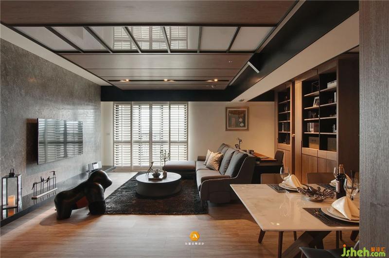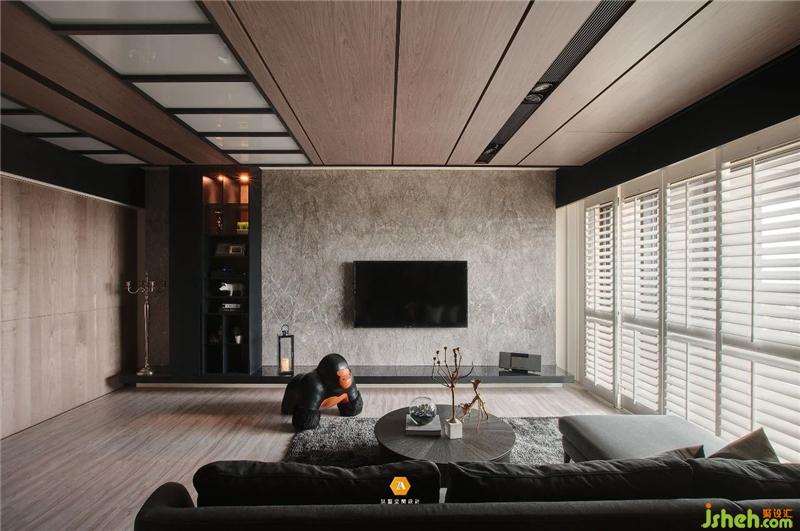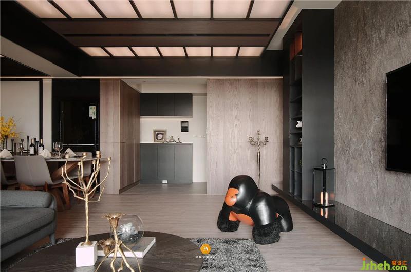 紧接着来到客厅,首先将视线吸引住的便是造型独特的天花造型,以及时尚大气的电视背景墙;天花以木质地为主要饰面,搭配等分的玻璃格子造型和金属勾勒,奠定了空间中的时尚意趣基调,丰富了空间层次感;电视背景墙以大面石材建构,简简单单,与天花的多样形成鲜明的对比,不仅让视觉的感受多样化,同时也让空间充满时尚简约的气息。