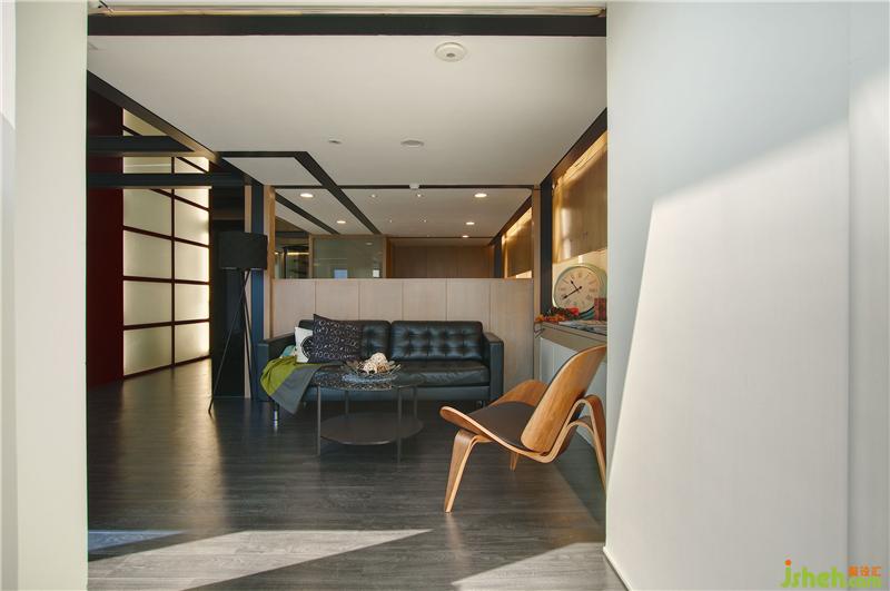 由大门进入,设计师将入口的第一个空间规划为接待区,摒弃华而不实的招待前台,以另一种新的形式规划空间,打破以往传统固有思维,让空间得到合理的分配。设计师藉由与廊道交错的空间,将其汇入到接待空间之中,让空间得到扩大,而沙发后的半高木饰面隔墙,则让人在步入空间时,不会有视线的阻隔,让视线得到延伸,扩大了空间感受。