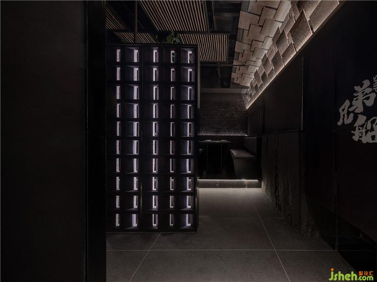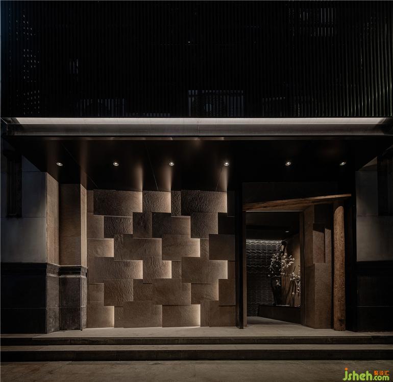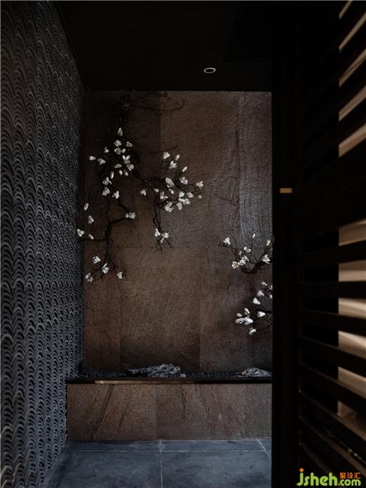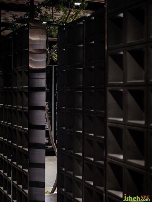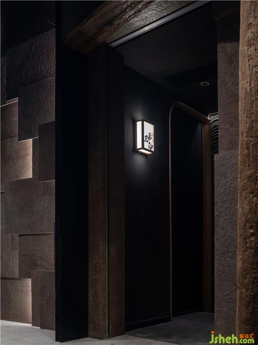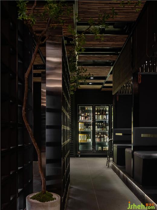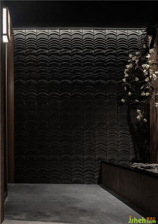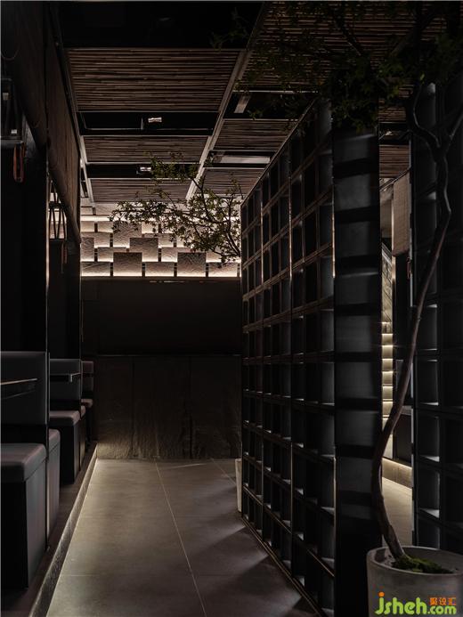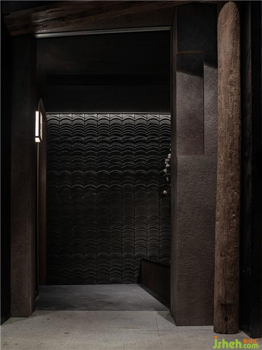 入口隐秘而低调,无招牌设计别具一格。日料餐厅设计拒绝平凡的立面表达,相互交叠的岩板错位分布,雕塑感的光影犹如鲤鱼鳞片栩栩如生,塑造印象深刻的感官体验。择老榆木树干作门头立柱,古朴的瓦片元素运用现代手法重复叠加,日式传统精粹融合现代设计精神,守拙出新。两株玉兰慵懒的攀缘在肌理感丰富的墙面上,东方美呼之欲出。微弱的间接光源融入氤氲的夜色中,引领食客暂别喧嚣,放松身心,体会慢生活格调。