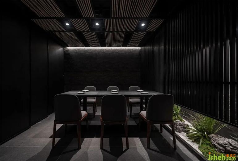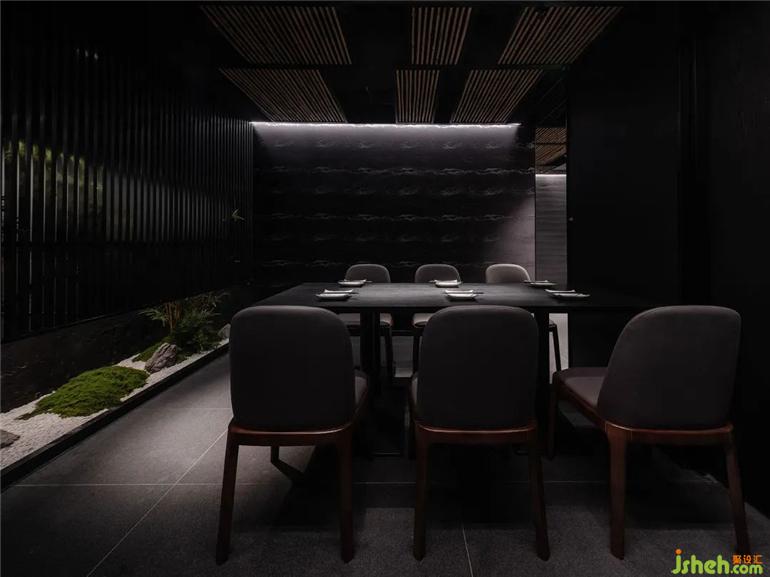 餐厅一侧引入日式枯山水造景,成为设计的点睛之笔,营造出一花一世界,一木一浮生的境界,日料餐厅设计仿佛在观赏一个微型的大自然。白砂、石、青苔、绿植,看似简约的摆置下,每一个自然之物都深有禅意。朴拙的东方调性,呼应现代的自由精神,侘寂之美融入此情此景中。
