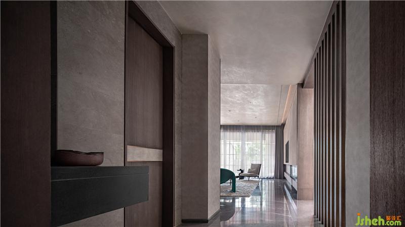 天花采用特殊环保材料,与地面的反光相呼应,让自然光最大程度地延伸入客厅的每个角落,不仅明亮了空间更使得居住体验感尤为通透。光线一直延伸至茶室走廊。温柔了岁月,慢放了时光。