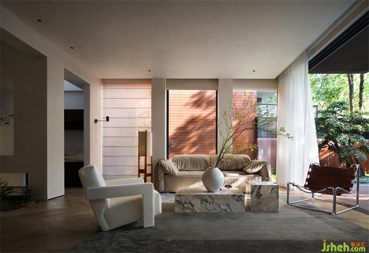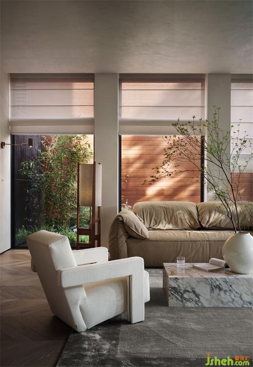 再往前便来到与室内无缝连接的大花园,打开大扇推门,迎着下午的暖阳和微风,室外的大片绿意肆意流入室内,让身体完全放松下来,享受或独处或朋友家人聚会的惬意时光。居所和空间之间的关联是一处又一处的小自然,内心生活就从这里开始,家的生动也从这里开始。