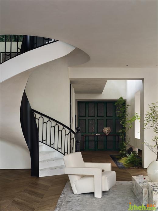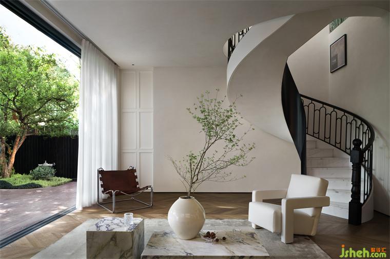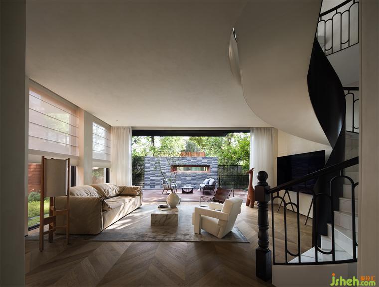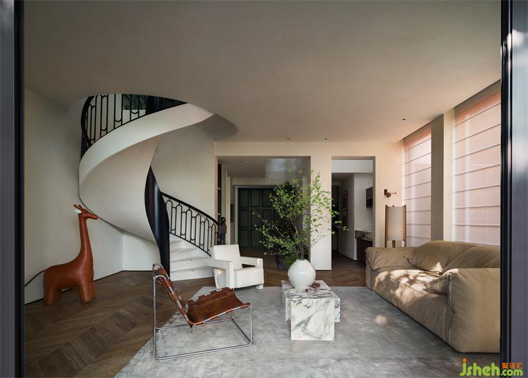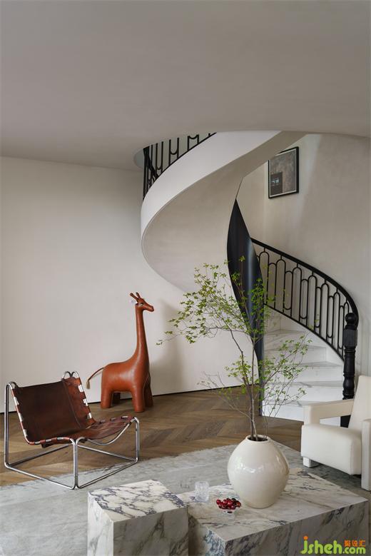 成都别墅设计师将一个原结构二层直跑楼梯分解成直跑和旋转楼梯,不仅将光线最大限度的引入室内,解决负一层采光弱的痛点,加强空气的流动,同时,旋转的曲线也为一层生活空间创造了某种律动,空间变得更为自由和生动。不论是自己家人在此活动,还是会客待友,都充盈着舒缓流动的氛围。