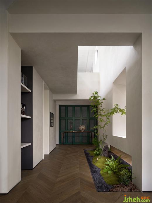 继续向室内走,双过道的设计亦给人友好之感。结构改造后营造出一处小天井,一是引入自然光,二是创造呼吸感,气息得以疏通切换。