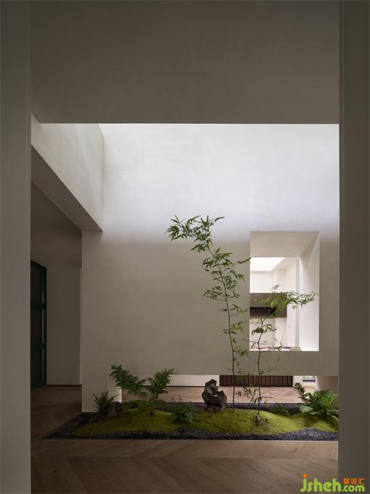 目光顺着天井往下看落到地面上,是设计师营造的一处室内的小自然,石头、青苔、高矮错落的植物,为两条过道带来了灵动的气息。天井外的自然光洒下来,迎接它们的正是这一片地面青绿。