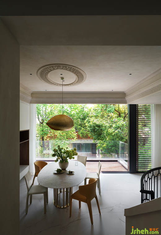 成都别墅设计以椭圆元素为主的主餐区既围坐亲和,又不像正圆餐桌那样的正式。楼梯处的绿色墙体有着大自然皮肤一样的肌理,与椭圆镜子里映射出的自然、户外真实的绿意形成呼应。