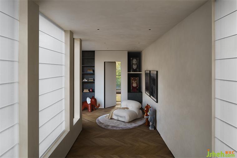 三层生活空间有着比一、二层更多的摄影和艺术品,其中,摄影都是男主人的生活习作与记录,凝固着自己和家人体验过的画面。设计师将此作为装饰家的艺术:将其散落布置在家的各个角落,画框里放进了往日存在,休息的时候就像休息在自己的往昔时光里,这样就能轻易的获得旧梦重温的美妙。