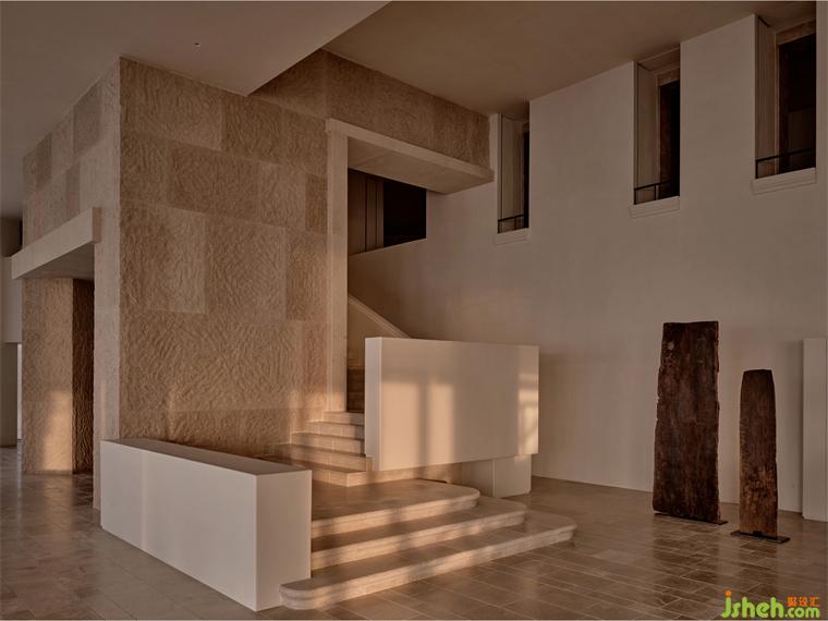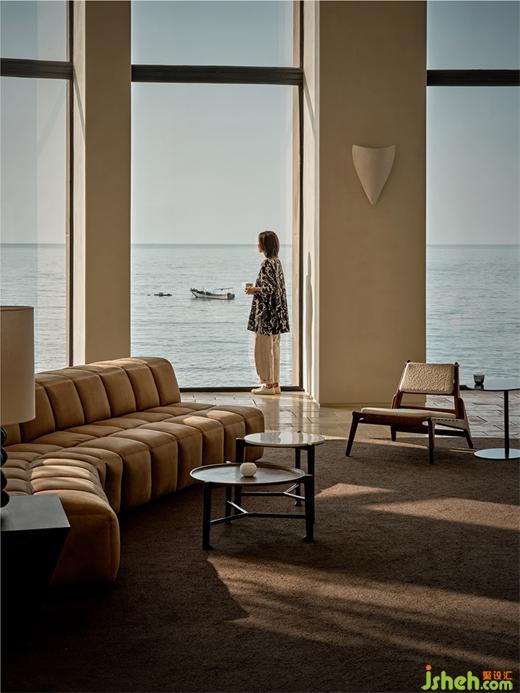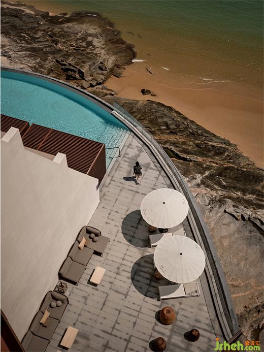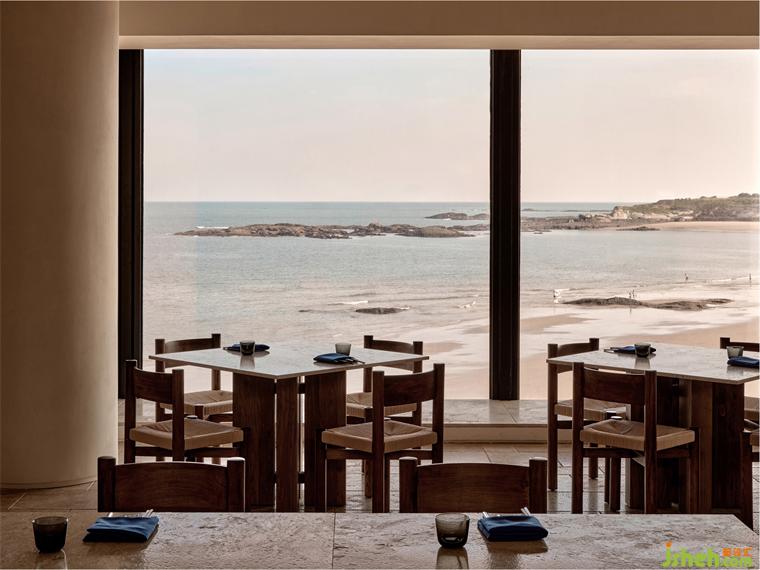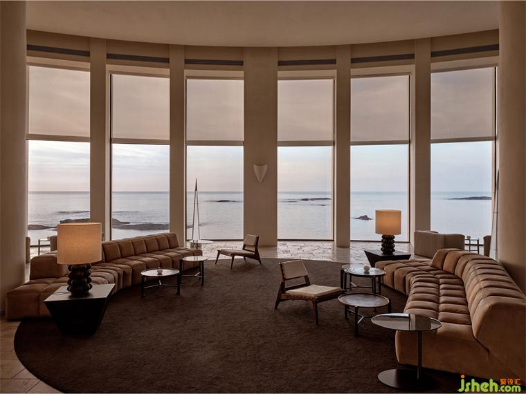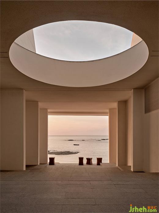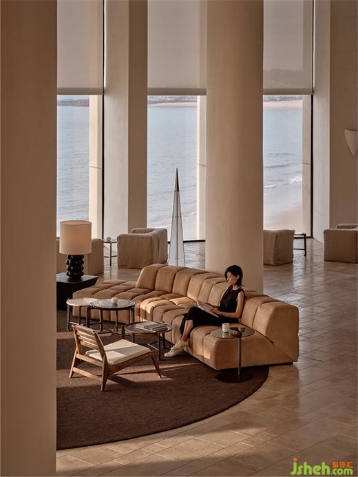 我们从入户开始重新建立空间秩序,酒店设计将台阶打磨成与礁石共生融合的形态,留出自然框景的“海天一色”作为前奏。并于整个空间的色彩、光影中呈现自然的节奏感,不同于室外的海天辽阔,进入大堂,干净利落的游廊以柱石的序列、米灰的色调和静谧的烛光来屏蔽嘈杂的干扰,配合大量的留白空间。